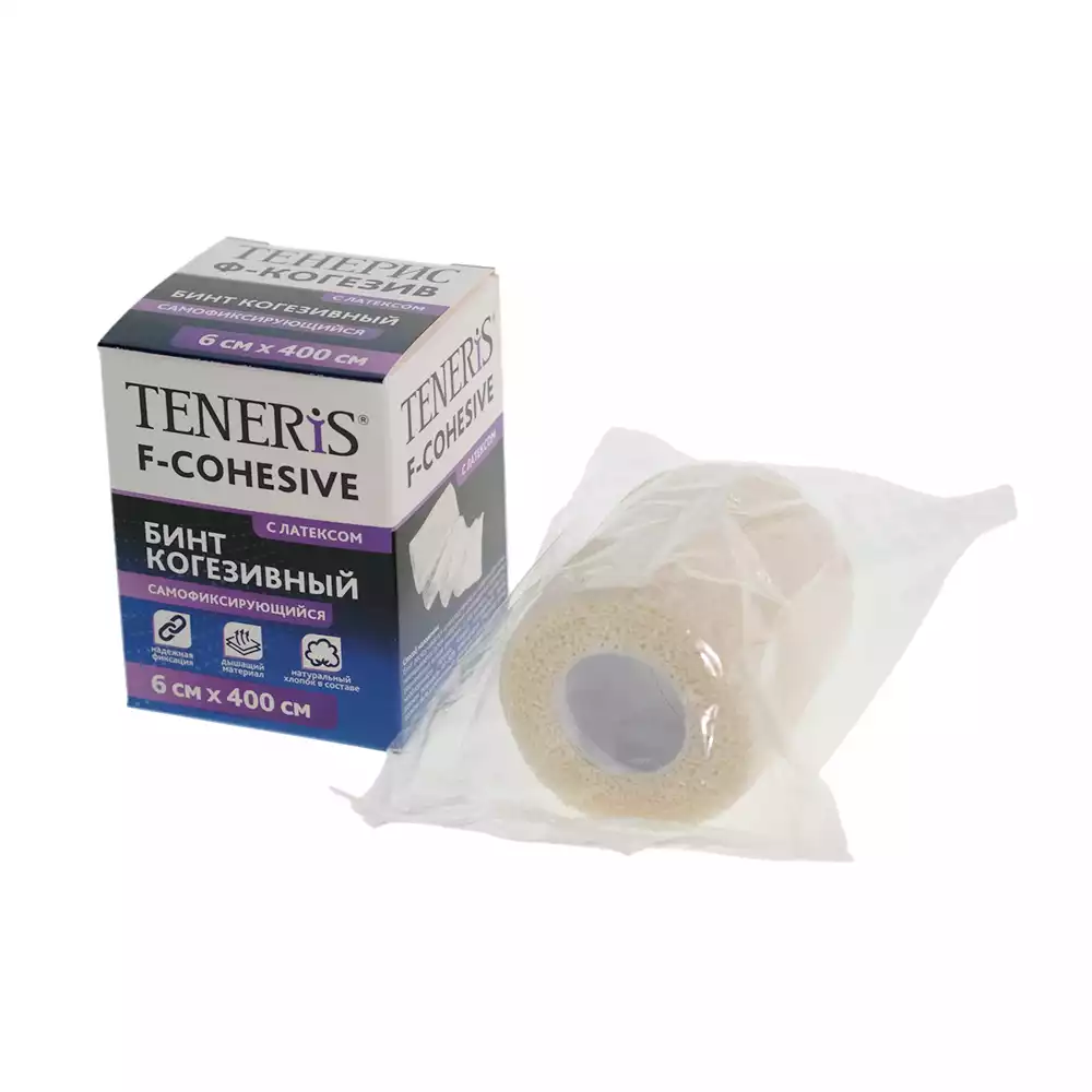 Бинт эластичный "Teneris F-Cohesive" cамофиксирующийся когезивный, с латексом, размер 4м*6см, цвет белый, ООО "ХЕЛСЛАБ" (РОССИЯ)
