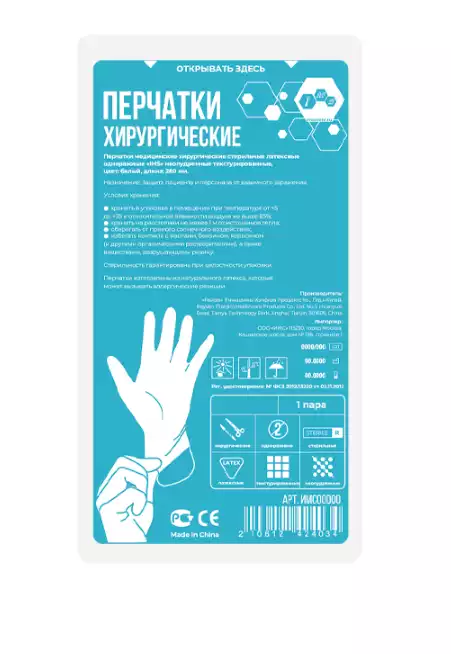 Перчатки BENOVY Термоформ хирургические, размер 8,0 латексные неопудренные текстурированные, стерильные, упаковка 50 пар, Zhejiang Gongdong Medical Technology Co, Ltd. (КИТАЙ)