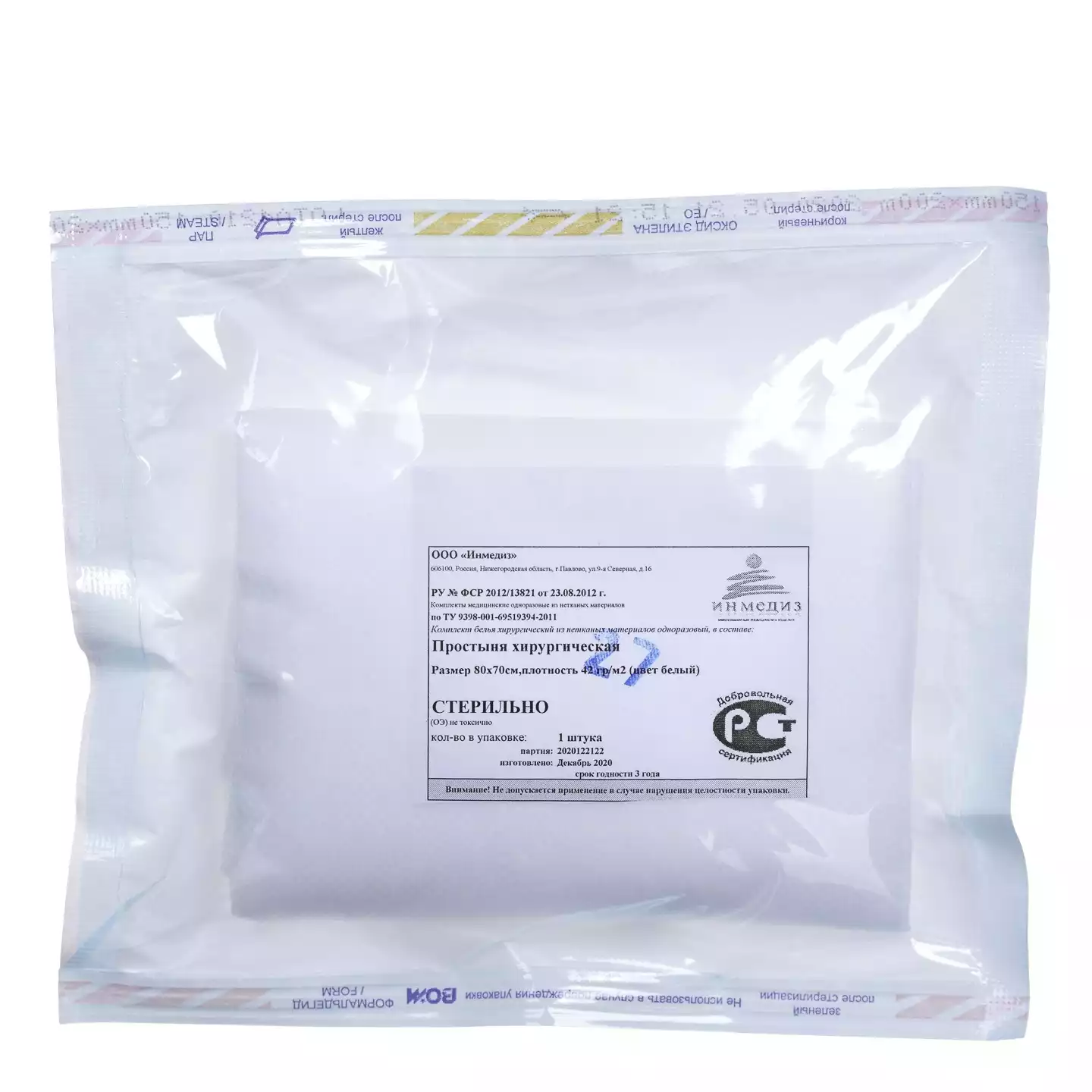 Простыня 70*80см, материал СМС 42м2, стерильная, белая, с РУ, Инмедиз (РОССИЯ)