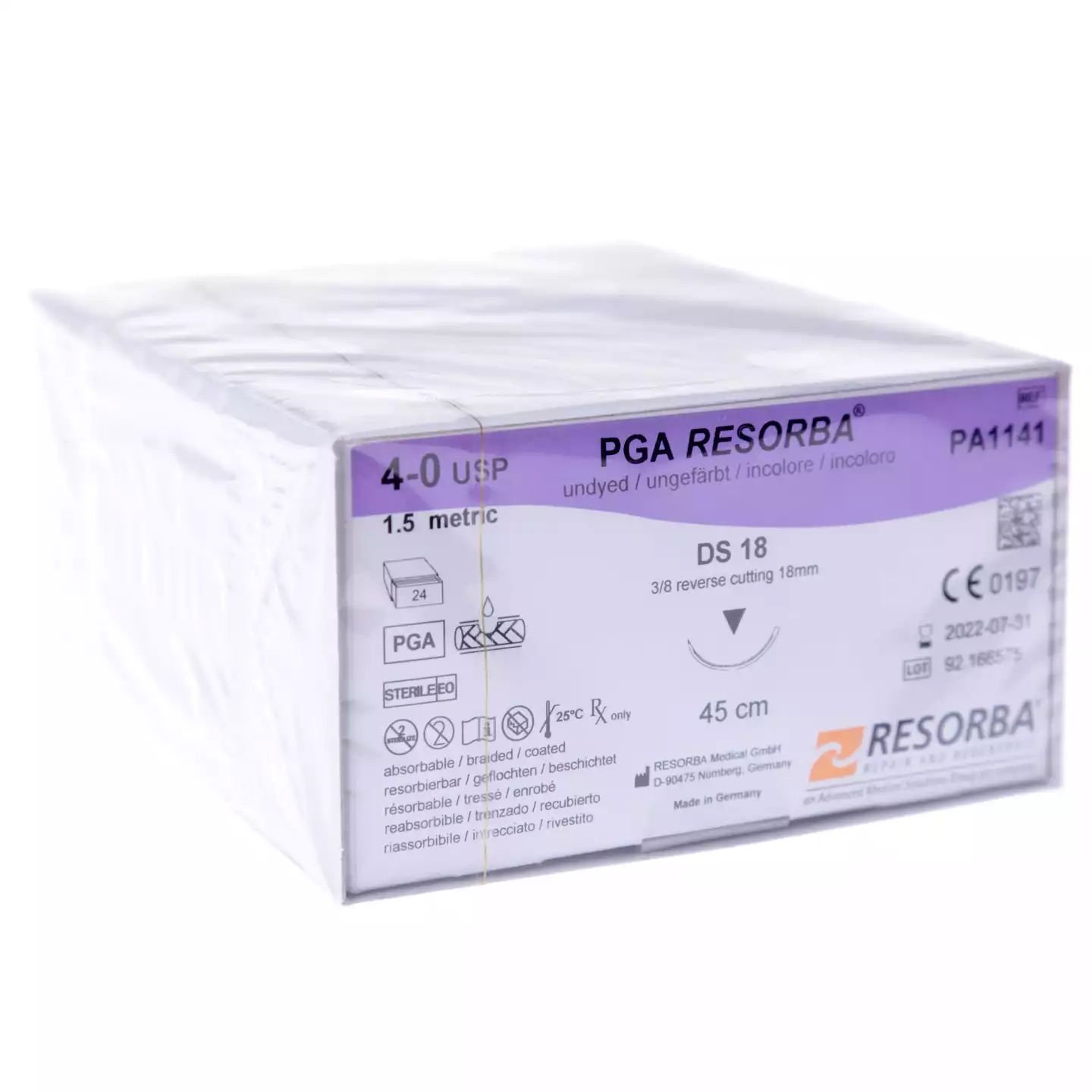 ПГА-РЕСОРБА (PGA) М 1.5 (4/0), длина 45см, игла DS 18 режущая 3/8 круга, неокрашенный, упаковка 24шт, РА 1141, Resorba Medical GmbH (ГЕРМАНИЯ)