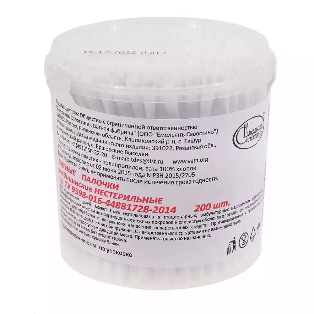 Ватные палочки "Емельянъ Савостинъ" №200, пластиковый стакан, Емельянъ Савостинъ ВФ (РОССИЯ)