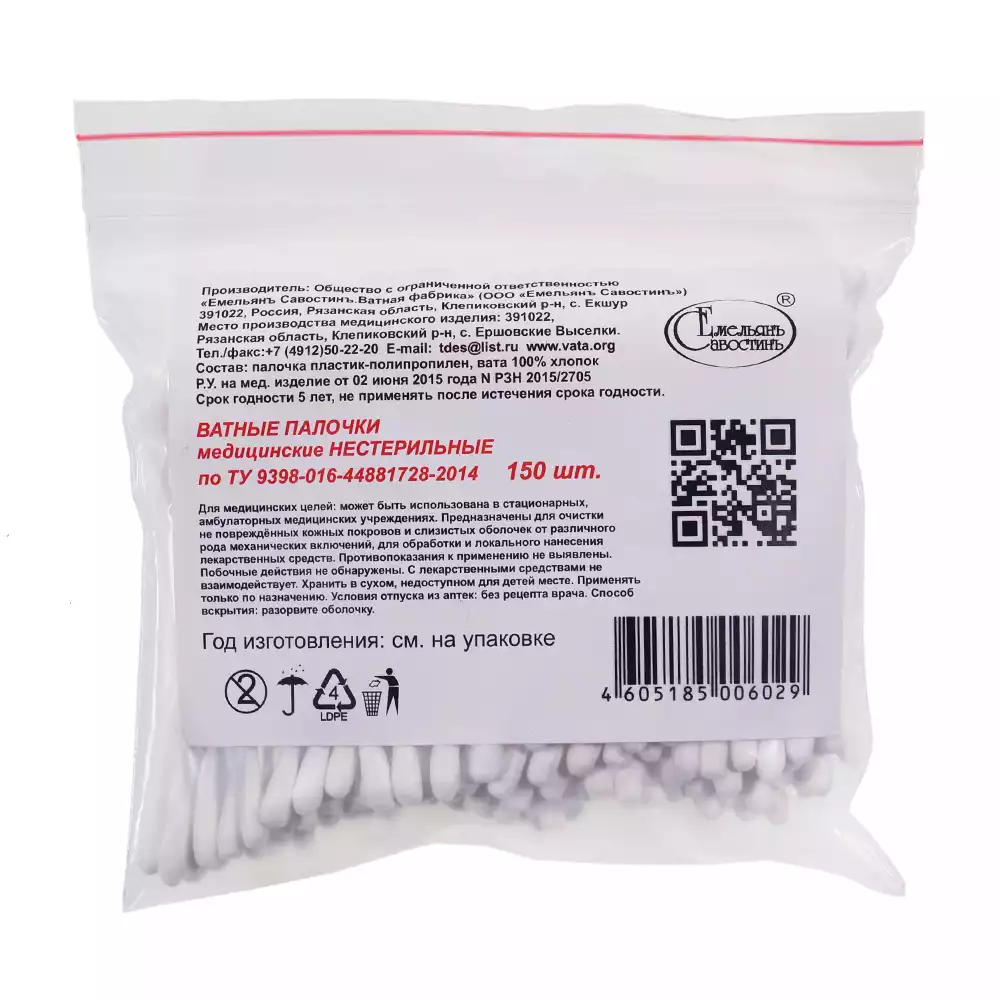Ватные палочки "Емельянъ Савостинъ" №150, п/э пакет, Емельянъ Савостинъ ВФ (РОССИЯ)
